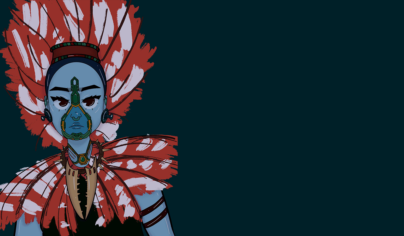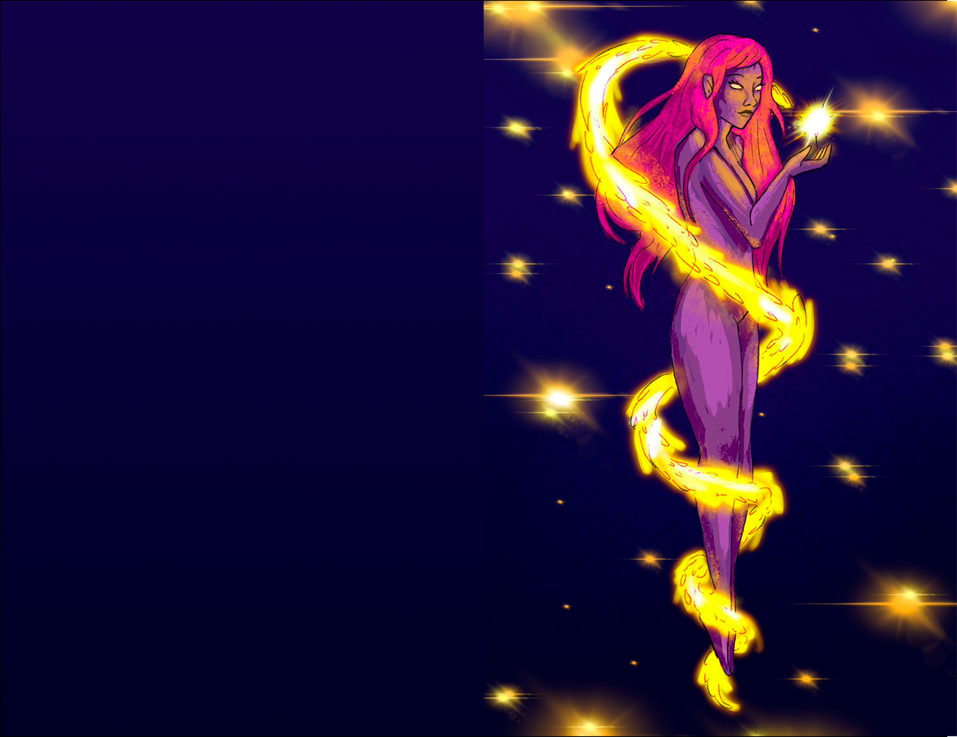 “Espacio” es la representación femenina de mi visión del cosmos, en su mano le da la bienvenida a una nueva estrella que salio de la estola iluminada que rodea su cuerpo. Esta ilustración tiene volúmen con manchones de color sin difuminar.