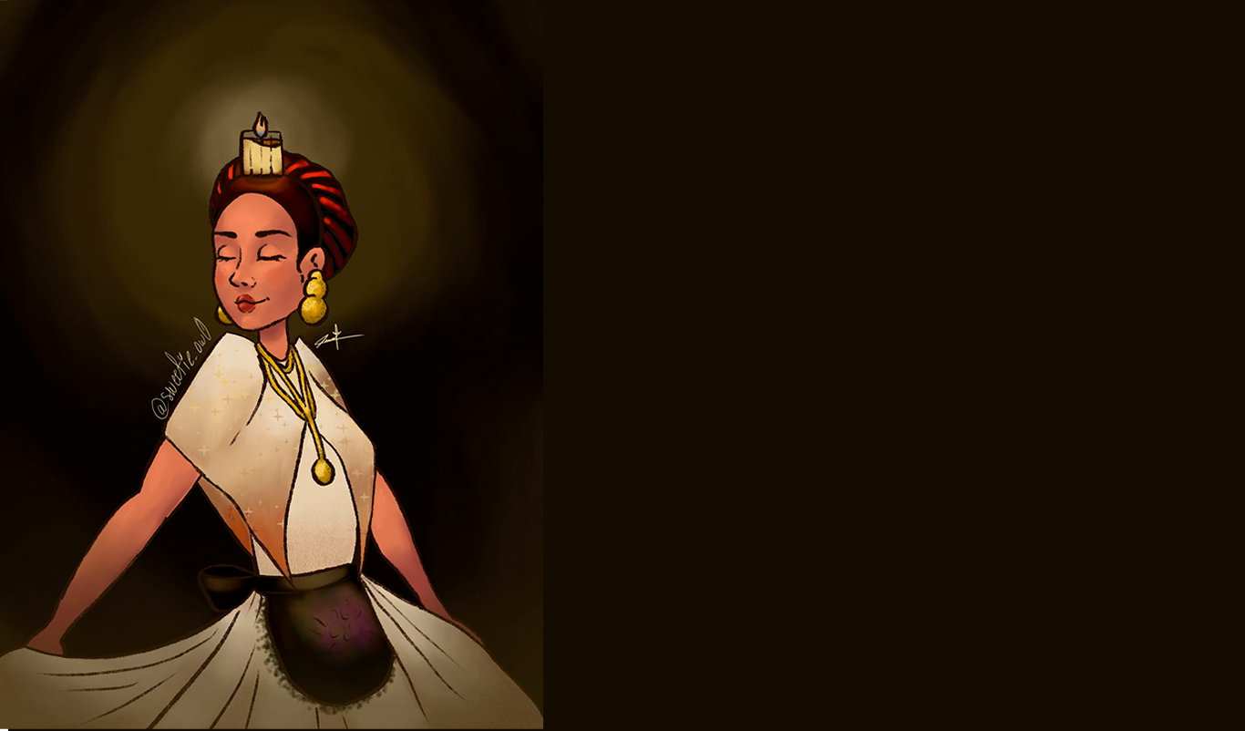 Esta ilustración es “la bruja”, está inspirada en una canción popular en Veracruz México,, buscaba representar ese momento de iluminación o elevación al hacer algo que disfrutas mucho, el personaje principal es una bailarina de danza regional.