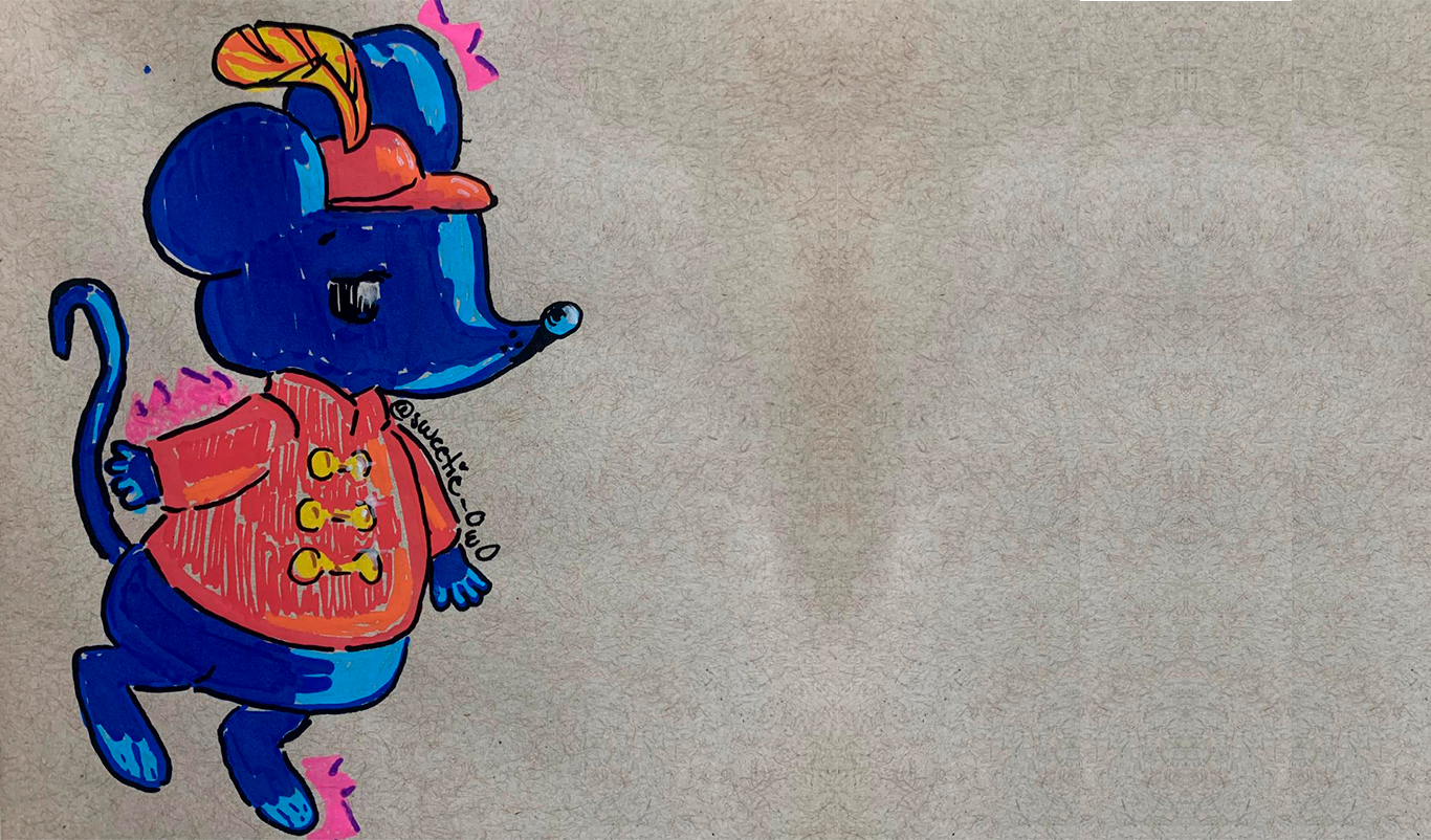 Este ratoncito está hecho con plumones de acrílito y la inspiración viene de un juego de palabras entre ratón y tambor, la idea era hacerlo con un estilo más relajado para que se acompañe el trazo con los colores más eléctricos y juveniles.